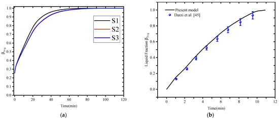 (a) Evolution of liquid fraction with three schemes of mesh elements, and (b) validation against the reported results of Darzi. A. (2015).