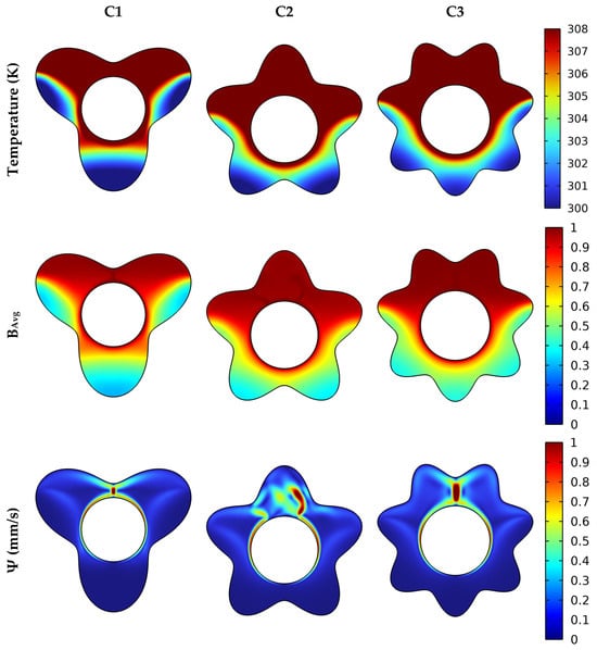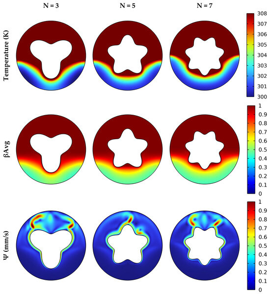 The effect of the inner tube shape is investigated in terms of the number of waves (N), which is 3 for trefoil, 5 for cinquefoil, and 7 for heptafoil. Figure 4 shows the temperature, melting process, and liquid phase speed contours at a melting time of 25 min. The higher temperature values exist at the top of the thermal storage unit, affected by the buoyancy effect of the melted PCM. The process starts with a conduction heat transfer from the inner tube wall to the neighbor PCM until the melting process starts. After that, the convection heat transfer occurs in the melted region as the hot regions experience low-dense PCM, rising up. This is the explanation of why the top regions are hot. The bottom regions are still at low temperatures due to the low amount of heat transfer by conduction, while convection has not reached this region yet after 25 min.