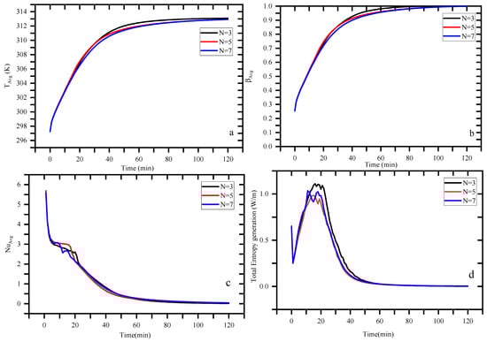 Figure 7 shows the quantitative results for the average temperature, average melting fraction, average Nusselt number, and total entropy generation. It is shown that the storage unit temperature approaches the heating source temperature after 135 min for cases N = 5 and 7, at which the PCM liquid fills the storage unit. For N = 3 cases, the time of 200 min is still insufficient to melt PCM fully. More than 45% of the melting process is enhanced for N = 5 and 7 compared to the case of N = 3.