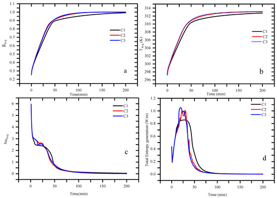 Once 30 min have elapsed, and as the melting process nears completion, a noticeable reduction in the temperature difference between the liquid PCM and the inner wall occurs. This diminishing temperature gradient results in a slowdown of the heat transfer rate and a subsequent decrease in thermal entropy generation. After this time threshold (t > 30 min), the contributions to entropy are predominantly due to the friction associated with the flow of liquid PCM, which remains relatively minor when compared to the thermal entropy generated during the phase change.
