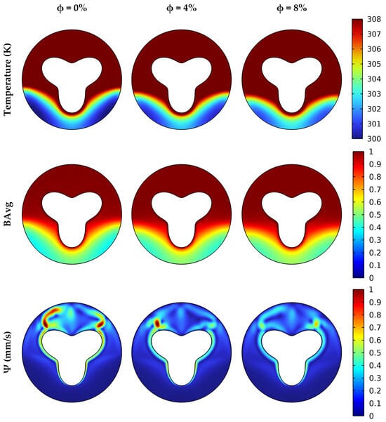 Figure 8 illustrates the temperature and melting contours of different cases, revealing that while the temperature profiles show only slight variations, the velocity contours demonstrate significant differences. Specifically, as the concentration of nanoparticles in the NePCM is increased, there is a corresponding rise in the effective density of the material. This increase in density is associated with a noticeable decrease in the velocity of the fluid, impacting the heat transfer dynamics. However, it is important to note that the contours themselves do not give a comprehensive picture of the enhancement of the melting process. For a more accurate assessment, the temporal profiles presented in Figure 9 are crucial as they provide deeper insights into the percentage of enhancement achieved through varying nanoparticle concentrations.
