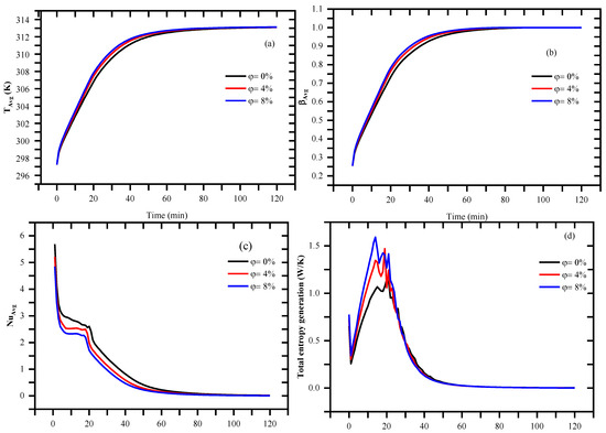 History of copper nanoparticle concentration influence on (a) average temperature, (b) average liquid fraction, (c) average Nusselt number, and (d) total entropy generation.
