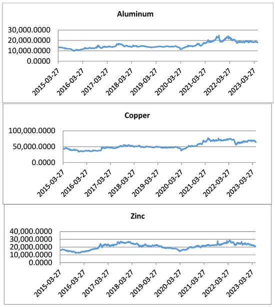 To ensure the accuracy of the research, it is required that the futures prices maintain continuity. Therefore, for the prices of the four non-ferrous metal futures in this paper, the daily closing prices of the nearest month’s futures contracts are adopted to ensure rolling continuity. Since the listing times of these four non-ferrous metal futures are not the same, in order to ensure the consistency of the time series, the time span of the sample selection is finally determined to be from 27 March 2015 to 16 May 2023. Each non-ferrous metal futures has 1979 daily closing price data. The data are all from the Flush database.