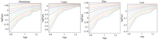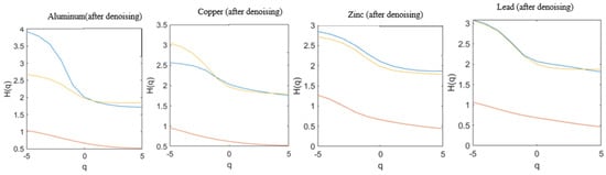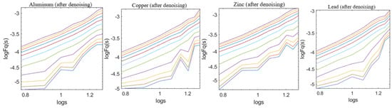 Figure 3 shows the double logarithmic fluctuation curves of the fluctuation function of the yield time series of four non-ferrous metal futures before and after denoising changing with s. Its slope is the generalized Hurst exponent h(q). The same color in the figure represents the same order q. It can be clearly seen from the figure that the generalized Hurst exponent h(q) of the four non-ferrous metal futures before and after denoising changes with the change in order q and is not a constant. This shows that these four non-ferrous metal futures are not monofractal before and after denoising but have multifractal characteristics. In addition, under different orders q, the fluctuation function gradually increases with the increase in s; there is an obvious power-law relationship, and it shows a trend of gradually converging.