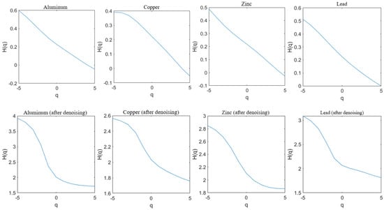 First, when the order q changes from −5 to 5, the generalized Hurst exponents of the yield series of four non-ferrous metal futures before and after denoising show a decreasing characteristic and are not a constant. This shows that, regardless of whether it is before or after denoising, the four non-ferrous metal futures all have obvious multifractal characteristics, indicating that the four non-ferrous metal futures markets all show complex volatility characteristics with both large fluctuations and small fluctuations.