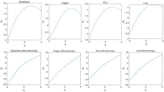Figure 5 shows the relationship diagram of the multifractal quality index τ(q) of four non-ferrous metal futures before and after denoising changing with q. If the market of the four products shows single fractal, then the quality index τ(q) is a linear function of q; if the market is multifractal, then the change in τ(q) with q is nonlinear, and the stronger the degree of nonlinearity, the greater the convexity, and the stronger the degree of multifractality. Based on the analysis results in Figure 5, we can clearly observe that the quality index τ(q) of four non-ferrous metal futures before and after denoising changes nonlinearly with q. This further verifies that the price market of four non-ferrous metal futures is significantly characterized by multifractal performance.