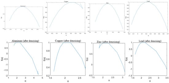 Multifractal spectrum analysis results of four non-ferrous metal futures before and after denoising.