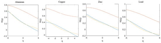 Second, by comparing the magnitudes of the ∆h(q) values of four non-ferrous metal futures, we can analyze the strength of the degree of multifractality between different non-ferrous metals. As can be seen from Table 2, for the original yield time series of four non-ferrous metal futures, there is such a relationship, where ≥ ≥ ≥ . That is, among the four non-ferrous metal futures studied, the degree of multifractality of Shanghai Aluminum, Shanghai Zinc, Shanghai Lead, and Shanghai Copper decreases in turn, and the market efficiency increases in turn. In addition, for the four non-ferrous metal futures after denoising, there is such a relationship, where ≥ ≥ . That is, after denoising, the multifractal order of Shanghai Lead and Shanghai Zinc has changed. Based on the h(q) values corresponding to Shanghai Lead and Shanghai Zinc futures being originally very close, this change in position order can be understood as the normal interference of noise. That is, the four futures basically maintain the basic stability before and after noise based on the change in the h(q) index. The degree of multifractality of Shanghai Aluminum, Shanghai Zinc, Shanghai Lead, and Shanghai Copper decreases in turn, and the market efficiency increases in turn. This indicates that Shanghai Aluminum has the highest fluctuation complexity, and Shanghai Copper has the lowest fluctuation complexity.