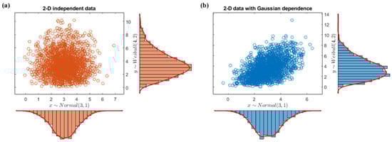 Sample from independent marginals and Gaussian copula. (a) A total of 2000 independent samples from a normal distribution with parameters 3 and 1 and a Weibull distribution with parameters 4 and 2; (b) A total of 2000 correlated samples with the same marginal distribution, and Gaussian copula parameter is 0.5.