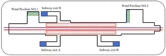 The station is equipped with three exits and two groups of wind pavilions, and both the station and its ancillary structures are constructed using the open-cut method. A plan view of Twenty Chong Station is presented in Figure 3 and Figure 4, showing the geological longitudinal section of the station, with the left side indicating the starting end and the right side indicating the terminating end of the station.