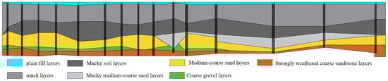 The site’s geotechnical features are characterized by a combination of artificial fill, soft soil, residual soil, and weathered rock. The artificial fill layers exhibit low bearing capacity and significant, uneven deformation, with high porosity and strong permeability. Improper handling during foundation pit excavation and pile drilling can easily result in sidewall collapse or incomplete piles. The silt and silty soil layers are notable for their high water content, high compressibility, large porosity, low shear strength, and high sensitivity. These layers are prone to liquefaction under vibration, leading to lateral sliding, settlement, and base deformation. Additionally, soft soil can undergo slow and prolonged shear deformation under stress, adversely affecting the settlement and stability of building foundations. Regional geological data indicate that the route predominantly traverses granite areas. The residual soil derived from granite consists of gravelly clayey soil, sandy clayey soil, and localized clayey soil, with poor uniformity. In its natural state, it has relatively favorable mechanical properties, with moderate-to-high compressibility. However, it tends to soften and disintegrate upon contact with water, resulting in a rapid reduction in strength. Its particle composition includes a high content of coarse particles (>0.5 mm) and fine particles (<0.005 mm), with fewer particles in the intermediate size range. This unique composition gives it characteristics of both sandy and clayey soils, making it susceptible to piping and soil erosion under excessive hydraulic pressure due to the movement of fine particles through the voids of larger particles. Given the complex strata involved in the foundation pit excavation at Twenty Chong Station, continuous monitoring and risk assessment are essential throughout the construction period to ensure stability and safety.