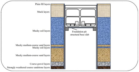 Drilling data from the construction site indicate that the strata within the excavation range of the station’s foundation pit mainly comprise plain fill layers, silty layers, silty clay layers, fine sand layers, silty soil layers, and medium-to-coarse sand layers. The structural base slab is located within the silty soil layer. For the open-cut foundation pit outside the station, the primary strata include fill layers and silt layers, with the structural base slab situated in the silt layer. The cross-sectional view of the retaining structure for Twenty Chong Station is shown in Figure 5.