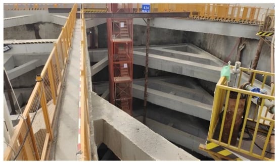 This project involves twelve types of monitoring items, including horizontal displacement at the top of the wall, column settlement displacement, settlement at the top of the wall, surrounding ground settlement, building settlement, internal force of the diaphragm wall, axial forces of the first, second, and third supports, soil inclinometer measurements, wall inclinometer measurements, and groundwater level monitoring. The actual support structure at the construction site is illustrated in Figure 6.