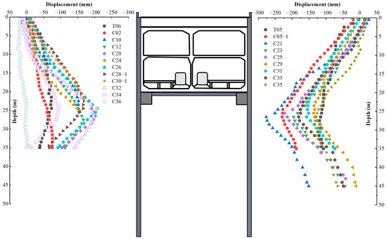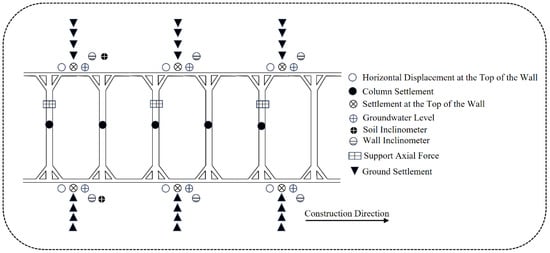 Monitoring points for horizontal displacement (at the top of the wall) are set at 15-m intervals. Monitoring points for vertical displacement (including column settlement displacement, settlement at the top of the wall, ground settlement, and building settlement) are also spaced at 15-m intervals. Monitoring points for deformation (using soil inclinometers and wall inclinometers) are drilled at 15-m intervals, with vertical intervals of 0.5 m between measurement points. Monitoring points for support axial force (including the internal force of the diaphragm wall, and axial forces of the first, second, and third supports) are arranged to cover more than 30% of the total supports. The number of monitoring points for each item is shown in Table 2, with some of these monitoring points illustrated in Figure 7.