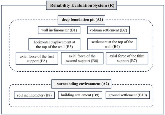 In this study, the weights of each monitoring data point for the reliability analysis are estimated using expert evaluation methods and the analytic hierarchy process (AHP), based on the characteristics of the monitoring data. As a result, the reliability of the deep foundation pit support structure is determined based on the monitoring data. The analytic hierarchy process (AHP) is a comprehensive evaluation method for system analysis and decision making, developed by American operations researcher and University of Pittsburgh professor T.L. Saaty in the 1970s [41]. It was proposed based on a thorough study of human thought processes and effectively addresses the quantification of qualitative issues. AHP’s primary feature is establishing a hierarchical structure that converts human judgments into pairwise comparisons of the importance of various factors. This approach enables the conversion of complex qualitative judgments into operational comparisons of importance [42]. In many cases, decision makers can directly use AHP for decision making, greatly enhancing the effectiveness, reliability, and feasibility of their decisions. It decomposes complex problems into multiple constituent factors and organizes these factors into a hierarchical structure according to their dominant relationships. The 1–9 scale method is a common approach for evaluating the importance of factors, using nine integers from 1 to 9 and their reciprocals as the evaluation scale [43]. Through pairwise comparisons, AHP determines the relative importance of decision options in a comprehensive ranking.