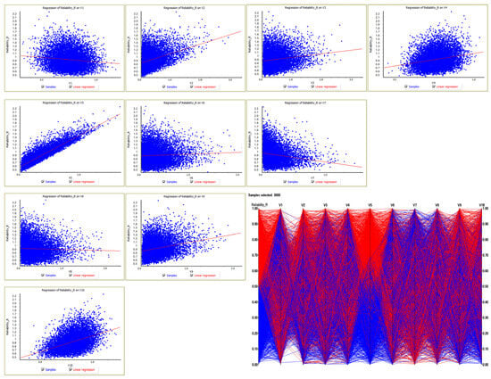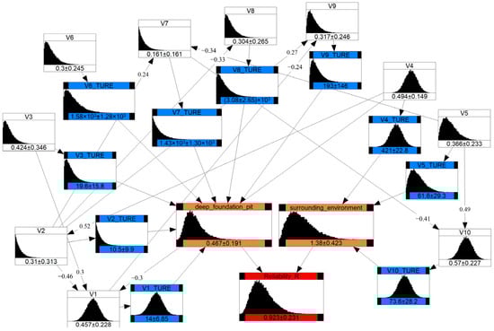 This section provides a detailed description of the entire process for designing the GCBN model structure. Firstly, in the Bayesian network, ten variables are set as root nodes (Vi, i = 1, 2, ……, 10), using the optimal marginal distributions as their probability distributions. After establishing the nodes, the parameters of the Gaussian copula function () are calculated based on Kendall’s tau correlation coefficients to establish relationships between the nodes. These relationships are represented by directed arrows connecting the nodes. The directions within the Bayesian network are further refined and adjusted based on expert knowledge. Finally, functional nodes are added to restore the normalized node data, facilitating the calculation of the failure probability of the support structure.