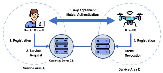 - Drone : The drone registers its information through the connected server responsible for its service area via the registration process. It is assumed that the drone is untrusted, with the possibility of malicious drones or exposure of stored information.