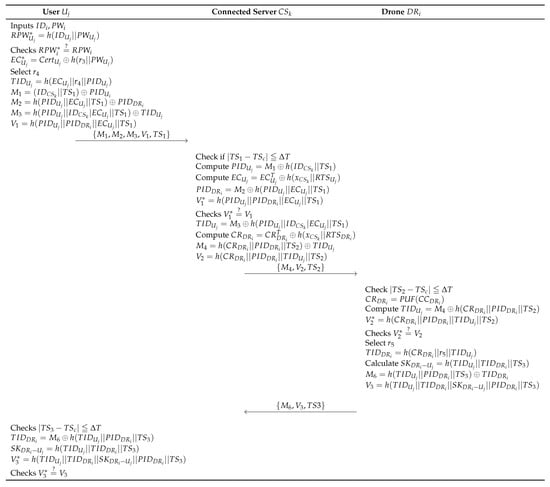 - : Upon receiving the message from the drone, the user verifies the validity of the timestamp and obtains using the following calculation:. Finally, the user generates the session key by computing . The user then verifies the session key by checking .