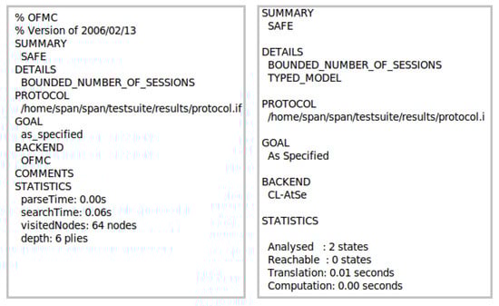 - Armando, A.; Basin, D.; Boichut, Y.; Chevalier, Y.; Compagna, L.; Cuéllar, J.; Drielsma, P.H.; Héam, P.C.; Kouchnarenko, O.; Mantovani, J.; et al. The AVISPA tool for the automated validation of internet security protocols and applications. In Proceedings of the Computer Aided Verification: 17th International Conference, CAV 2005, Edinburgh, UK, 6–10 July 2005; Proceedings 17. Springer: Berlin/Heidelberg, Germany, 2005; pp. 281–285. [Google Scholar]