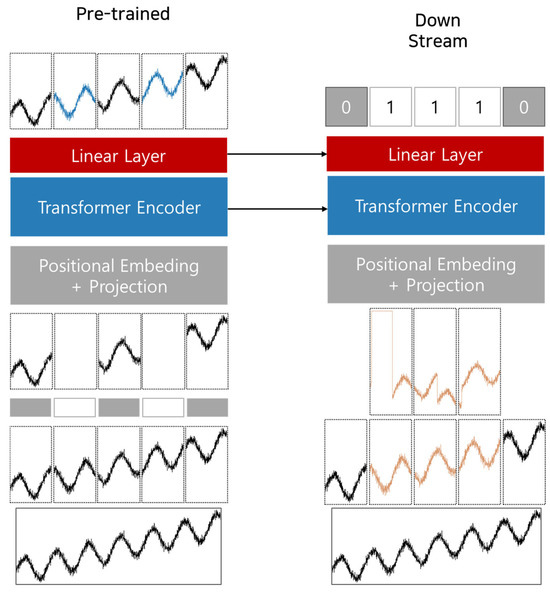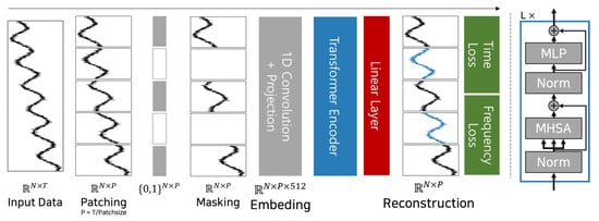 In time series data research, studies have focused on improving data representation learning performance through masked modeling [18,48]. Masked modeling involves masking a portion of the data and reconstructing it. This technique plays a crucial role in handling missing data and is particularly effective for learning abstract representations while conceptualizing locality within patches. In this paper, we propose a self-supervised learning method that reconstructs masked portions of the data using a patch-based masking approach. Masking techniques are particularly valuable for addressing anomalies caused by missing physical measurements, which often occur when electronic devices encounter issues. Sensors or measurement equipment in electronic devices can experience faults or errors during data collection for various reasons, leading to data loss or the recording of anomalous values. Missing physical measurements are a frequent challenge in time series data, making reconstruction or the supplementation of missing information essential. The self-supervised learning approach to reconstruct masked data is well-suited to tackling this issue. By masking missing data segments and reconstructing them, the model learns the patterns and characteristics of the time series data. A model trained using masking techniques contributes not only to the restoration of missing physical data but also to the improvement of overall data representation learning performance. The extent to which the reconstructed data match the original data serves as a key metric for evaluating the model’s learning performance. Moreover, during the reconstruction process, the model learns both the locality within patches and the global relationships across the time series, ultimately enhancing the overall expressiveness of the data representation.