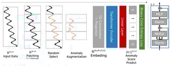 - Anomaly loss: The model trained based on Equation (1) calculates anomaly loss using binary cross-entropy. The input data are divided into patches, and patches are randomly selected for anomaly augmentation. The model then learns the anomaly label for each augmented patch . Based on the predicted label , an anomaly score is derived by averaging. The model is then trained to minimize a binary cross-entropy loss function, as shown in Equation (7), based on this anomaly score.