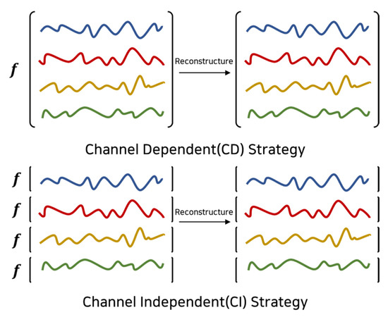 Figure 5. Comparison of channel-dependent (CD) and channel-independent (CI) strategies in time series reconstruction. - One-dimensional convolution-based value embedding: The value embedding in a transformer model is directly related to the three key matrices used in the self-attention mechanism: queries, keys, and values [50]. Since it plays a crucial role in the attention computation—the core mechanism of transformer models—it is essential to optimize its generation process. Traditionally, MLPs (multi-layer perceptrons) are used to generate the value embedding. However, MLPs do not explicitly capture positional or sequential correlations among different parts of the input data. To address this limitation, we utilized a 1D convolution-Based value embedding approach. Using 1D convolution allows the model to learn the relationships among adjacent values at each time step, effectively capturing local patterns. Additionally, since 1D convolution learns weights dynamically, it can adapt to the data and incorporate positional information. This embedding is represented in a the space. Furthermore, to incorporate dynamic positional information, relative positional encoding is applied within the layer, enhancing the representation of position-dependent features.