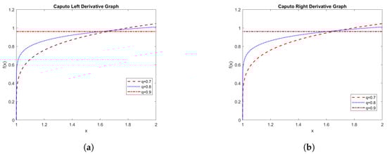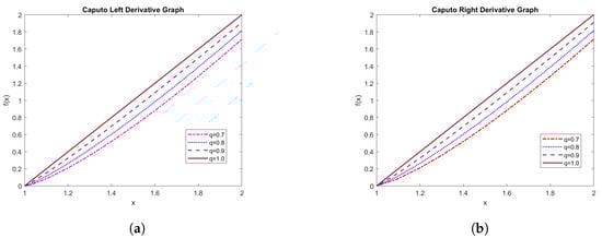 This proves that the Caputo left derivative of is equal to the Caputo right derivative of at every point on including the points a and In addition, when we obtain from the left derivative and from the right derivative, which satisfies part (b) of Theorem 2.2 in [] (p. 93). It should be noted that the Caputo left derivative of and the Caputo right derivative of cannot be obtained in closed form. This addresses the issues raised in reference [] about the relation of the Caputo left and right derivatives. For that purpose, we present several examples, including numerical examples.
