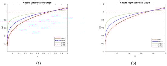 - The Caputo left derivative of any function at any point for will be equal to the Caputo right derivative of at the same point and vice versa.