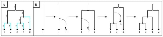 Ford’s -model [2] is a probability model over the set of labeled topologies of fixed size. For a given value of the parameter , this model generates a random labeled topology t of size n by first selecting a permutation of the labels uniformly at random; then, starting from the one taxon tree whose leaf is labeled by , a tree of size n is generated as the n-th element of a sequence (1) of trees of increasing size, in which tree is obtained by attaching a new pendant edge labeled by to a random edge of tree . Depending on the value of , the -insertion of the new pendant edge has to satisfy the following rule: each pendant (resp. internal) edge of has probability (resp. ) to intersect the new edge. For instance, consider the labeled topology t of size shown on the right of Figure 1B, which in Newick format is written as . If , then the insertion process that generates t is the one depicted in the figure, that is,