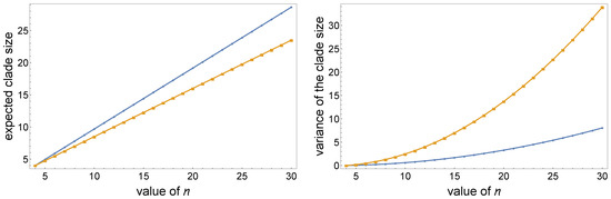 Our goal in Section 3 was to measure how much a sequence of random -insertions modifies the clade size of a set of initially monophyletic leaves. To this end, in Theorem 1 we have determined the probability mass function, mean, and variance of the clade size of the set of k leaves belonging to a random labeled topology of size obtained through a sequence of -insertions starting from a tree of size k labeled by the symbols in P. As might be expected, our results show that lowering the value of the parameter , that is, decreasing the probability of attaching new leaves at the internal edges of the tree, increases the expectation of the clade size variable and reduces its variance (Figure 3).