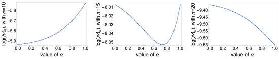 - For different values of n, we can observe a different behavior by plotting the (natural logarithm of the) probability as a function of α (Figure 4). The mentioned probability can be an increasing function of α (left panel), a decreasing function of α (right panel), or a unimodal function of α (middle panel).