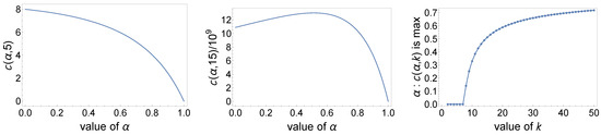 The asymptotic constant is plotted in Figure 5 for (left) and (center). The plot has different shapes depending on k; it is strictly decreasing when , while it has a maximum at when . The value of the parameter at which the constant reaches its maximum is shown as a function of on the right of Figure 5. Note that for small values of k, i.e., , is maximum when , that is, when the Ford model corresponds to the Yule model. When , the uniform model () is the phylogenetic scenario that maximizes .