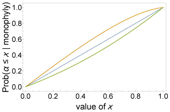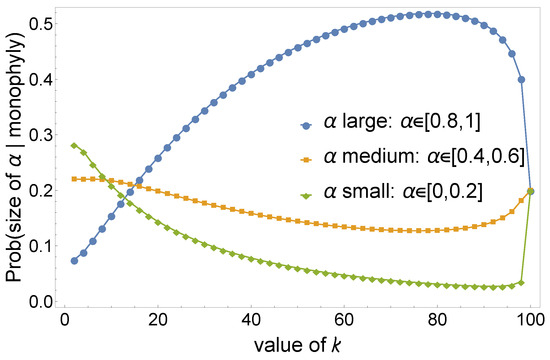 where is the prior density function of . In Figure 6, assuming a uniform prior distribution on the parameter, i.e., , we plot the conditional cumulative distribution of when a random sample of k leaves is observed to be monophyletic in a random labeled topology of size . The plot shows that for a relatively small value of k, i.e., (top curve), the probability of is increased for every x with respect to the prior distribution (the dashed line). For a larger value of k, i.e., (bottom curve), the probability of instead increases for every x, suggesting that small values of alpha are more likely when observing the monophyly of a small sample of leaves. This is confirmed by the plot in Figure 7, where we have calculated the conditional probability of being either small (), medium () or large () when k random leaves are seen to be monophyletic in a Ford-distributed tree of size , again assuming a uniform prior distribution on . The probability of a small or large value of respectively decreases or increases with the first values of k, while the probability of a medium value of appears to be more uncorrelated with k. For small, medium, or large , the Ford model has its best-known instances respectively provided by the Yule (), uniform (), or comb () model of random labeled topologies, respectively, and our calculations can be used to infer which model is more likely to produce a given tree of size n in which a set of k random leaves is found to form a clade. In the final part of Section 4, we have further investigated the probability of monophyly by determining its asymptotic behavior (Theorem 3). We have shown that decreases like a constant multiple of for every , that is, as in (14). Thus, for a given value of k, the probability of monophyly is asymptotically larger for those values of at which the factor attains its maximum (Figure 5, right).