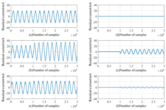 Figure 1 shows the residual current waveforms for various typical electric shock types. Figure 1a–c present the residual current waveforms under three-phase unbalanced conditions, simulating various inherent leakage currents in the circuit. Even without an electric shock, the current transformer can still capture waveform data. Specifically, Figure 1a shows the no electric shock waveform, which is a regular sine wave with stable amplitude and no sudden variations. Figure 1b represents the animal electric shock waveform, which demonstrates a sharp change in amplitude after an electric shock occurring at 1 s, resulting in a short circuit in the circuit. The amplitude of the waveform increases significantly from the moment of the shock, reaching its maximum value after several cycles and maintaining that value. Figure 1c represents the plant electric shock waveform, where the amplitude increases slightly following the electric shock, but the change is less pronounced than that in the animal electric shock. Figure 1d–f shows the residual current waveforms under three-phase balanced conditions, representing an ideal operating condition without inherent leakage current. Under this condition, Figure 1d shows the no electric shock waveform with the amplitude consistently remaining at zero. Figure 1e shows the animal electric shock waveform, where the amplitude gradually increases after the shock, reaching its maximum value after several cycles, with the waveform remaining sinusoidal. Figure 1f represents the plant electric shock waveform, where the amplitude slightly increases after the electric shock, with the change not being as pronounced. In summary, the residual current waveform is relatively stable under normal leakage, and no leakage conditions in the low-voltage power grid. However, when a biological electric shock occurs in the low-voltage grid, the amplitude of the residual current signal for animal shocks exhibits a sharp change under both conditions, whereas the amplitude change for plant shocks is less significant. This difference arises because plants have higher impedance, closer to insulation, which is much greater than the impedance of animals, leading to less noticeable amplitude changes in plant electric shocks.