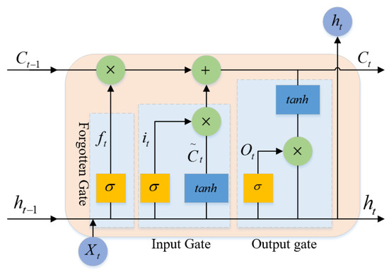 A Long Short-Term Memory (LSTM) network is an improvement method for the shortcomings of RNN. Different from RNN, LSTM introduces a special gating mechanism. This structural improvement effectively solves the problem that RNN only has short-term memory, as well as the problem of gradient disappearance and explosion, thereby enhancing the model’s ability to remember long-term dependent states [14]. LSTM mainly regulates the operation of the entire network through input gate, forget gate, and output gate.