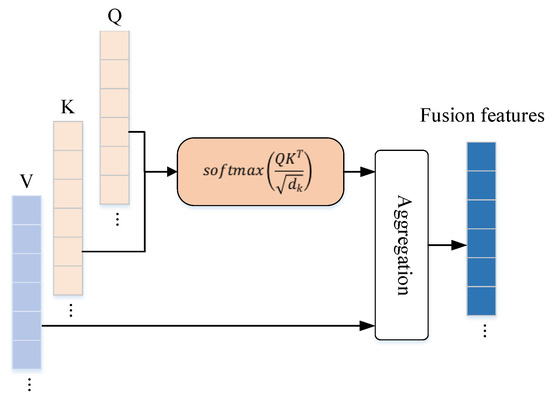 In deep learning, the attention mechanism possesses the ability to prioritize important information, similar to human vision [18]. Its essence is a mapping relationship between query, key, and value.The self-attention mechanism is a special type of attention mechanism that enables the model to selectively focus on different parts of the input sequence while evaluating the interdependence between input elements, thereby improving the accuracy of the model [19,20,21]. In the self-attention mechanism, the input sequence undergoes different linear transformations to generate the query matrix, key matrix, and value matrix. Then, the similarity between them is calculated using the scaled dot product and normalized by the Softmax function to obtain the weight coefficient. The attention mechanism framework is shown in Figure 3.