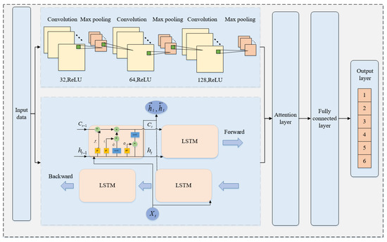 Therefore, in order to retain the advantages of CNN and BiLSTM in data feature extraction, this paper proposes a fault diagnosis method that combines CNN and BiLSTM features using attention mechanism. Figure 4 shows the workflow of the CNN-BiLSTM-AM hybrid model proposed in this paper. The hybrid model consists of three parts: the CNN module, BiLSTM module, and attention module. The specific steps of fault diagnosis of this model are as follows: