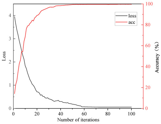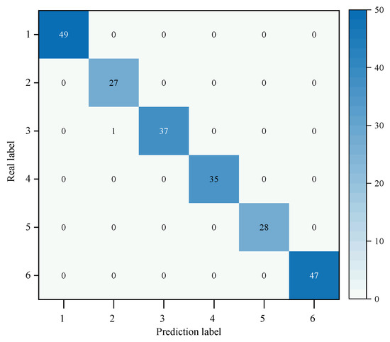 The analysis of the misclassification reveals that the plant used in this experiment had a high impedance and poor conductivity, approximating insulation. In such a case of electric shock, the residual current closely resembled that of the normal state, leading to the occurrence of the misdiagnosis. The experimental data set is imported into the hybrid model for training. The training process and accuracy of the model are shown in Figure 5. After 100 iterations of training, the fault diagnosis accuracy of the test set reached 99.55%. It can be seen that after the 60th iteration, the loss function and accuracy of the model have shown good convergence. Figure 6 presents the confusion matrix for the classification results on the test set, indicating that the model in this paper has good classification performance. However, there was one instance of misclassification, where an animal electric shock under three-phase balance was incorrectly diagnosed as no electric shock under three-phase balance. The analysis of the misclassification reveals that the plant used in this experiment had a high impedance and poor conductivity, approximating insulation. In such a case of electric shock, the residual current closely resembled that of the normal state, leading to the occurrence of the misdiagnosis.