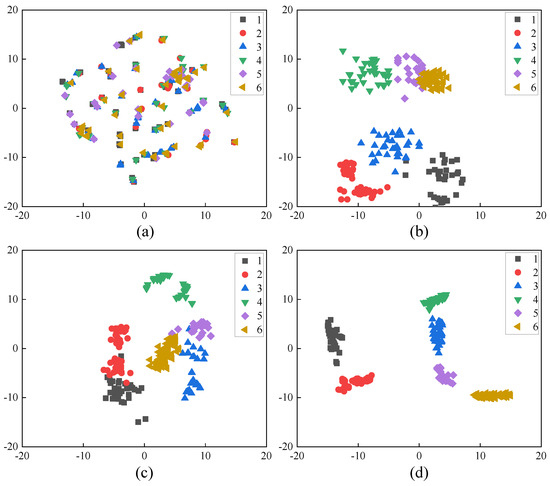 Figure 7a shows the visualization results of the original data input to the model, in which the data of each category are staggered and scattered randomly, without forming clustering. Figure 7b shows the visualization result of the original data after CNN layer feature extraction. There is an obvious clustering phenomenon in each category. However, there is still some data overlap between categories 5 and 6, and categories 1 and 3, making it difficult to achieve accurate classification. Figure 7c shows the visualization result after BiLSTM layer feature extraction. Although the clustering effect of each category is more obvious, there is still overlap between categories 1 and 2, as well as categories 3, 5, and 6, making it difficult to distinguish accurately. Figure 7d shows the hybrid model classification results after using the attention mechanism to fuse CNN and BiLSTM features. A clear clustering phenomenon can be seen in the figure, and there are obvious boundaries between each category. It shows that after using the attention mechanism to fuse the feature extraction results of CNN and BiLSTM, the classification effect of the model has been significantly improved, making it possible to accurately distinguish between categories. This visualization process demonstrates the shortcomings of using CNN or BiLSTM alone for diagnosis, and verifies the effectiveness of model fusion through the attention mechanism in this article.