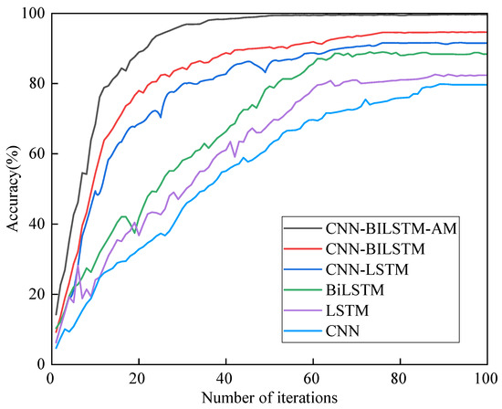 To avoid randomness in the model comparison experiments, multiple trials were conducted for the models mentioned above, and their average results were taken. The diagnostic accuracy curves are shown in Figure 8. It can be observed that the training accuracy curves of the CNN, LSTM, and BiLSTM models show an overall upward trend, but their accuracy fluctuates significantly during the iterations and the convergence speed is slow, resulting in lower diagnostic accuracy. The reason for this result is that the single CNN model only focuses on the spatial local features of the signal, while the single BiLSTM only focuses on the temporal features of the signal. Both cannot fully extract the electric shock information in the residual current signal. The training accuracy curves of the CNN-LSTM, CNN-BiLSTM, and CNN-BiLSTM-AM models converge rapidly after 60 iterations, and the accuracy rates all exceeded 90%. Among these models, the accuracy curve of the CNN-BiLSTM-AM model shows the fastest convergence speed and the highest accuracy, reaching 99.55%. This result verifies that the parallel feature fusion model outperforms other serial connection models in performance.