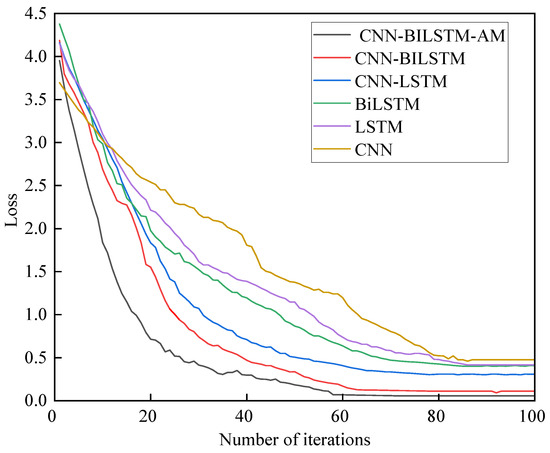 It can be seen that all indicators of CNN-BiLSTM-AM have reached more than 99%, which is significantly better than CNN-BiLSTM, CNN-LSTM, BiLSTM, LSTM, and CNN. Analyzing Figure 7b and Table 3, it can be concluded that the parallel-connected hybrid model can better retain the feature information extracted by a single model than the serial combination model. The attention mechanism allows channels with more critical features to obtain higher weights, which enhances the learning ability of the model and accelerates the convergence of the model.