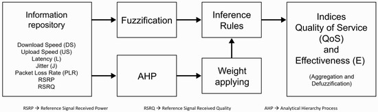 49]. In the first block, reference is made to the information repository collected through crowdsourcing with user equipment (UE). The KPIs recommended by the ITU for the evaluation of the QoS of the LTE network are shown: download speed (DS), upload speed (US), latency (L), jitter (J), packet loss rate (PLR), the reference received signal power (RSRP), and the reference received signal quality (RSRQ). Next is the fuzzification block, where each input’s membership functions and membership degrees are determined. Then, the inference rules block is observed, and the fuzzy rules are proposed based on expert knowledge. On the other hand, the analytical hierarchy process block proposes the importance of weighting for each input KPI, aiming to obtain the importance weights corresponding to the weight application block, which are to be applied to the fuzzy rules. Finally, in the last block, the QoS and Effectiveness indices are obtained through Aggregation and Defuzzification. Each of the blocks is detailed in