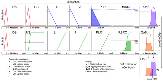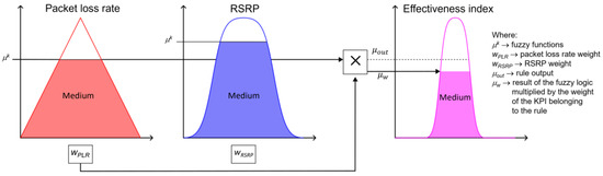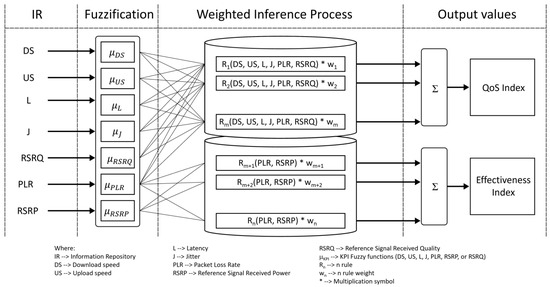 Figure 1, detailing the architecture of the weighted fuzzy inference system. The first column contains the information repository (IR), where the input variables (KPI) used to obtain the fuzzy QoS index are DS, US, L, J, RSRQ, and PLR. The input variables for the fuzzy effectiveness index are PLR and RSRP. The second column shows the fuzzification, where each input KPI’s functions and degrees of membership are determined, with three linguistic variables for each: Low, Medium, and High. Next, in the third column, the Weighted Inference Process is observed. Here, the fuzzy rules are proposed as follows: 433 to obtain the fuzzy QoS index and 9 for the effectiveness index. In addition, the weight vector or eigenvector corresponding to the input variables is obtained for each output index. For quality of service, important comparisons between DS, US, L, J, PLR, and RSRQ are considered, while for effectiveness, importance comparisons between PLR and RSRP are considered. Subsequently, the result of each fuzzy rule is multiplied by the weight of the KPI that determines that same rule (weight that applies). Finally, in the output values column, the quality of service and effectiveness indices are obtained with aggregation and defuzzification. The above is detailed in