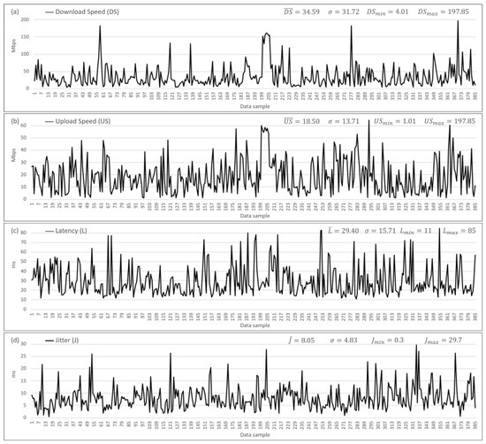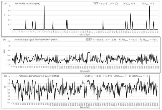56]. The variables of interest are the seven key performance indicators recommended by the ITU for evaluating the quality of service of the LTE network: download speed, upload speed, latency, jitter, packet loss rate, RSRP, and RSRQ [