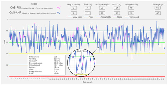 Figure 9a between the QoS-FIS and the QoS-AHP can be seen in different data samples. This is caused because, in the AHP evaluation, the importance weights assigned to the upload and download speed amplify or attenuate the behavior of the quality of service concerning the FIS. In the AHP evaluation, the importance levels assigned to each KPI were based on the relevance of the quality parameters in the performance of OTT applications recommended in the ITU Quality of Service Regulator Manual. Download and upload speed are the most relevant, followed by packet loss rate, jitter, latency, RSRP, and RSRQ.