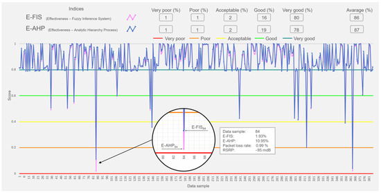 Figure 9b shows a more significant difference between the E-FIS and E-AHP models in the effectiveness evaluations with values of less than 1% because the influence of the weighting on the packet loss rate is more critical than RSRQ’s. In this case, the AHP evaluation is amplified. The rest of the values compared between E-FiS and EAHP present an average difference of 1% due to the similarity between both evaluation models.