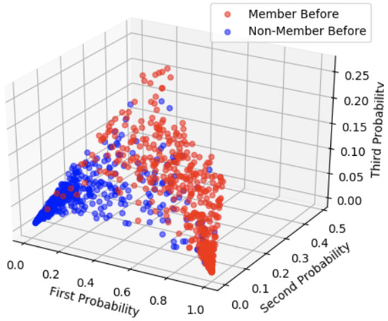 To observe the changes in the model’s outputs for training and non-training data before and after unlearning more intuitively, we integrated the three dimensions mentioned above into a three-dimensional feature space. The three features are the model’s top-1 prediction probability value for the data, the cosine similarity, and the training loss. The following figure presents the three-dimensional space plot generated by combining these dimensions before and after unlearning. As can be seen from the figure, the original training data exhibit a more concentrated distribution, as training reduces their uncertainty; whereas the non-training data’s distribution is more dispersed and random. After executing the unlearning process, the distribution of the original training data becomes as dispersed and random as that of the non-training data (see Figure 6).