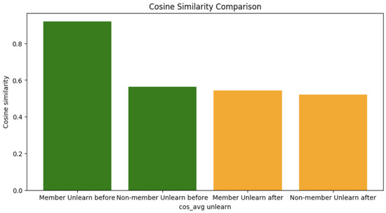 In EncoderMI, the authors conducted membership inference attacks by exploiting the difference in output cosine similarities between member and non-member data. Theoretically, the cosine similarity calculated using the model’s output for similar-origin augmented member data should be very high, approaching 1, while the cosine similarity for non-member data should be lower. We leveraged this difference to assess the effectiveness of our unlearning method. If our method truly induces unlearning, the cosine similarity of similar-origin augmented data for forgotten samples should be very close to that of non-member data.