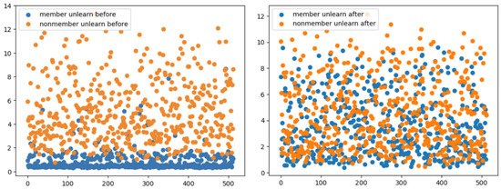 The third approach involves comparing the loss differences between training and non-training data. In the contrastive learning framework, the computation of a data sample’s loss value is dependent on the other data samples in the batch, as they provide negative sample support. Despite this, calculating the loss for each data sample can still, to some extent, reflect the differences between training and non-training data. We can compute the loss for a batch of member data and a batch of non-member data using the model. The resulting loss differences can reveal the discrepancies between training and non-training data. The following figure illustrates the changes in the loss values for training and non-training data before and after unlearning (see Figure 5).