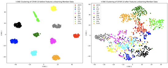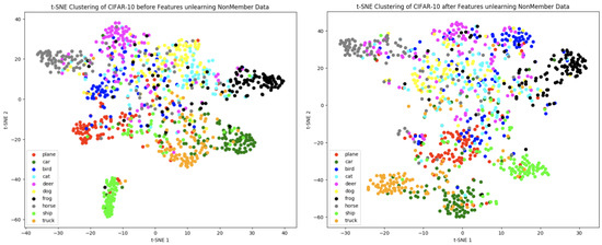 We employed the t-SNE dimensionality reduction technique to observe the changes in the model’s prediction outputs for the data before and after unlearning, as illustrated in the figure below. The results clearly show that after applying our unlearning method, the prediction outputs for training and non-training data become increasingly similar. Before unlearning, the distribution of the training data is highly concentrated, with relatively large distances between different classes, indicating that the model exhibits high certainty in its predictions for the training data. However, after executing the unlearning operation, we observe a significant increase in the prediction uncertainty for each class, causing the distances between classes to become closer. This outcome indicates that our method successfully treats training data as though it had never been trained, thereby protecting the data effectively. This treatment makes it difficult to distinguish between training and non-training data, effectively preventing membership inference attacks. Through this experiment, we have demonstrated the effectiveness of our method in protecting the privacy of training data and provided strong support for further research in machine unlearning (see Figure 7 and Figure 8).